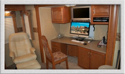 She also wanted a bedroom whose bed went sideways across the coach within its own slideout. This provided a lot more closet space with sliding mirrored doors and drawer spaces. The large mirrors also have an enhancing visual effect on the perceived space.