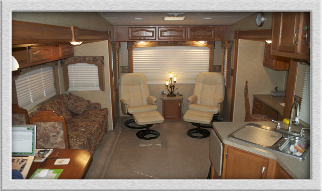During our research of 5th wheels of various vintages, I came to the conclusion that the most space for a given length came in the form a floor plan with two of its slideouts on opposing sides at the rear of the coach. This gave a very open living space of fourteen feet from wall to wall within the slideout area and plenty of walking space between the fixed furniture.